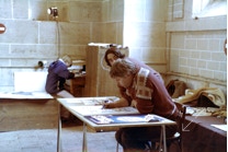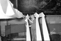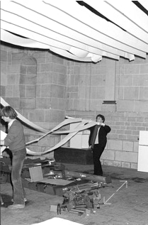 Déjà, notre premier souhait était de « couper » la salle pour la rendre moins haute de plafond. Pour ce faire j’ai eu l’idée de tendre des fils de fer et d’y accrocher des feuilles de rouleau de papier Sopalin. Ce fut un travail fastidieux qui nous prit une bonne partie de la nuit mais qui en valait le coup. Cela métamorphosait complètement la salle qui paraissait bien plus grande.