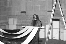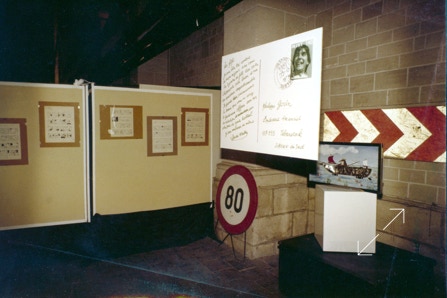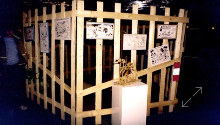 La partie expo était constituée de dessins, de photos, de sculptures et agrémentée d’objets en phase avec le décor et le thème. Pour l’expo de 1981 dont le thème était le chantier, nous avions récupéré auprès des services techniques de la ville tout un lot de palissades en bois et de panneaux de chantier. Les palissades étant agencées pour nous faire des panneaux d’accrochage.