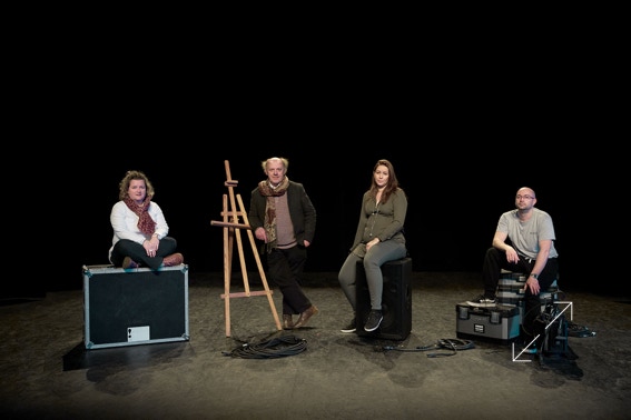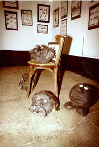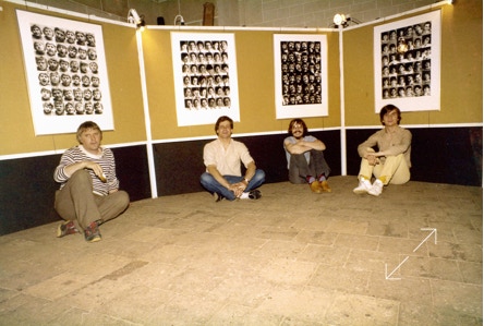 Les artistes devant leur grimaces avec de gauche à droite : Mimi, Xavier, Didier et Philippe durant l’expo 1981