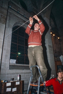Le travail éprouvant de la pose du faux plafond. Ici c’est Christiane (Kiki) qui s’y colle aidée par Philippe Govin.